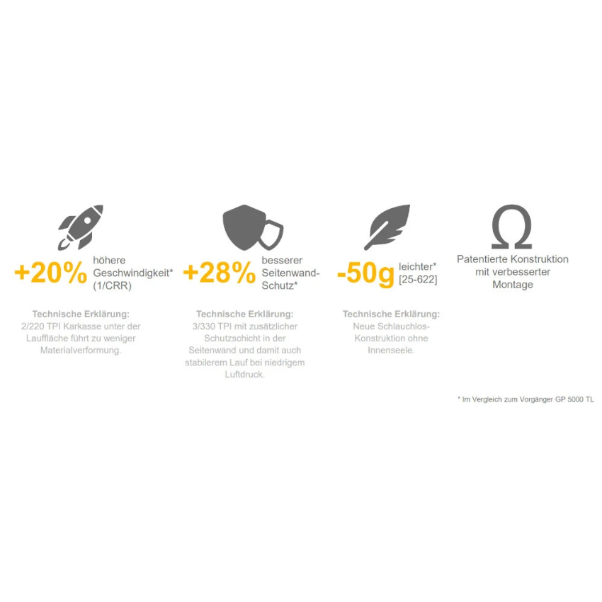 The tread pattern in the shoulder area of the tire, inspired by Continental's 5000 ST R racing tire, provides increased cornering grip and also reduces drag.